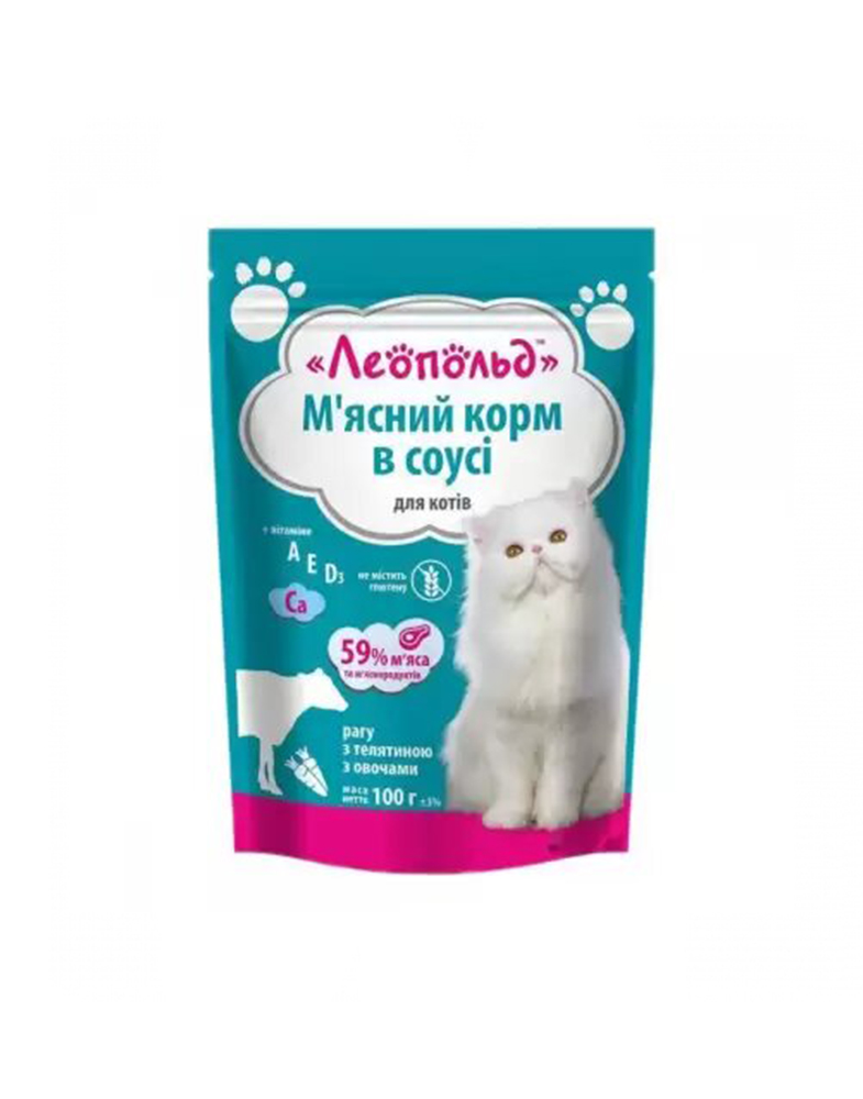 Збалансований вологий корм для кішок Леопольд М'ясний корм для повноцінного харчування домашніх улюбленців. Смачне рагу зі шматочків телятини з овочами, приготовлені в ніжному соусі, стане улюбленою їжею кішки.