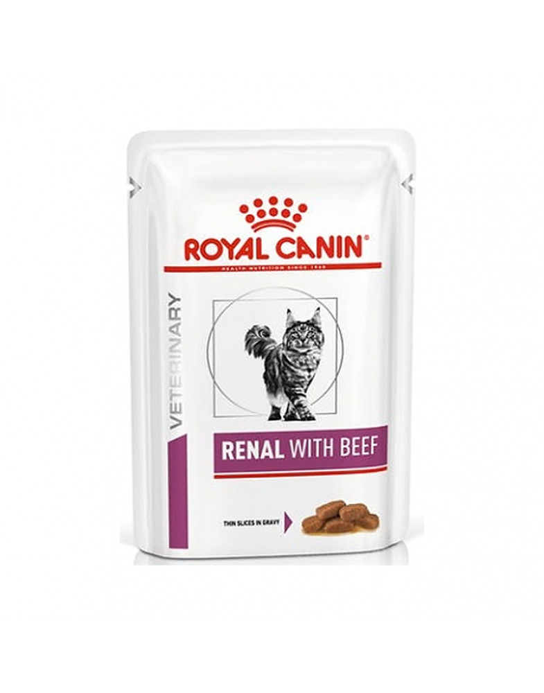 Корм консервований повнораціонний дієтичний для дорослих кішок з яловичиною для підтримки функції нирок при гострій або хронічній нирковій недостатності. Ветеринарні дієти, в тому числі і корм Royal Canin Renal With Beef, розроблені для застосування під наглядом ветеринарного лікаря. Royal Canin рекомендує обов'язково звернутися за консультацією до ветеринарного лікаря перед початком чи продовженням застосування ветеринарної дієти.