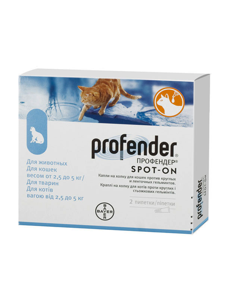 Profender spot-on краплі при лікуванні і профілактиці гельмінтозу у котів вагою від 2. 5 кг до 5 кг. Ви прекрасно знаєте, як небезпечні гельмінти, вони приносять шкоду не тільки тваринам, але ними можуть заразиться і господарі, а найстрашніше діти. Що б уникнути такої небезпеки при перших же симптомах потрібно виводити паразитів, а в подальшому кожні 3 місяці робити профілактику гельмінтозу.