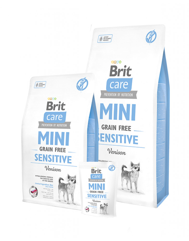 Гіпоалергенна формула для дорослих собак мініатюрних порід з чутливим травленням. Brit Care Mini Grain Free Sensitive - повнораціонний, беззерновой, сухий корм супер преміум класу з відмінною засвоюваністю. Містить цінне м'ясо оленя, а також необхідні поживні речовини, вітаміни і мінерали, необхідні для здоров'я собак міні порід. Корм забезпечує організм собаки необхідною енергією і запобігає виникненню харчової непереносимості і алергії на злаки. Дуже добре підходить маленьким собакам, чутливим до звичайних м'ясних інгредієнтів корму.