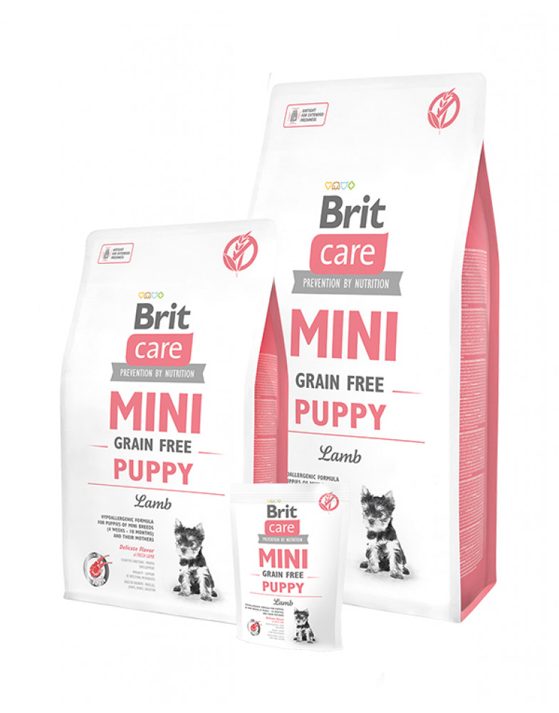 Гіпоалергенна формула для цуценят міні порід (вага дорослої собаки до 10 кг) у віці від 2 тижнів до 10 місяців, а також для годуючих самок. Brit Care Mini Grain Free Puppy - повнораціонний, беззерновой, сухий корм супер преміум класу з відмінною засвоюваністю. Містить всі необхідні поживні речовини, вітаміни і мінерали, а також цінний жир лосося, багатий незамінними жирними кислотами Омега-3 і Омега-6, необхідними для нормального росту і розвитку, а також поліпшення розумових здібностей і навчання цуценят. Корм підходить для цуценят з алергією на злаки або чутливим до звичайних інгредієнтів корму.