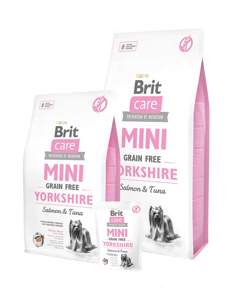 Гіпоалергенна формула для дорослих собак породи йоркширський тер'єр. Brit Care Mini Grain Free Yorkshire - повнораціонний, беззерновой, сухий корм супер преміум класу з відмінною засвоюваністю. Містить цінне м'ясо лосося, багате поліненасиченими жирними кислотами Омега-3 і Омега-6, які надають позитивний вплив на розвиток серцево-судинної системи та обміну речовин, оздоровлює шкіру і шерсть собак, а також корисне м'ясо тунця, яке має найвищий вміст білків серед риб , велика кількість вітамінів, мікро- і макроелементів.