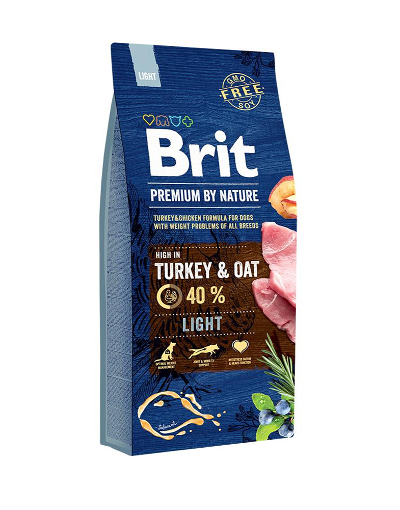 Brit Premium Light Turkey & Oats - сухий корм для собак з надмірною вагою преміум класу. Зіткнувшись з набором зайвої ваги вихованців, власникам варто подбати про вибір для своїх підопічних харчування з низькою калорійністю. Тільки так можна допомогти тваринам прийти в тонус, навіть якщо вони мало часу проводять за активними іграми або фізичними навантаженнями. Така турбота дозволить захистити улюбленців від розвитку цукрового діабету та інших складних недуг, що виникають через надмірну вагу. Справитися з подібною проблемою допоможе сухий корм для собак Brit Premium Light преміум класу.