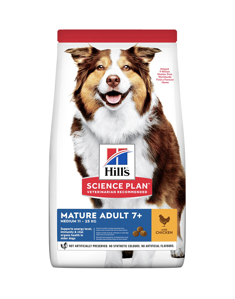 Hill's Science Plan Mature Adult 7 + Active Longevity корм для собак з куркою (курка 22%; загальний вміст м'яса свійської птиці 32%) - повноцінний раціон для собак старше 7 років. Розроблено, щоб допомогти підтримувати рухливість і здоров'я життєво важливих органів. Містить антиоксиданти з клінічно підтвердженим ефектом і хондроїтин.