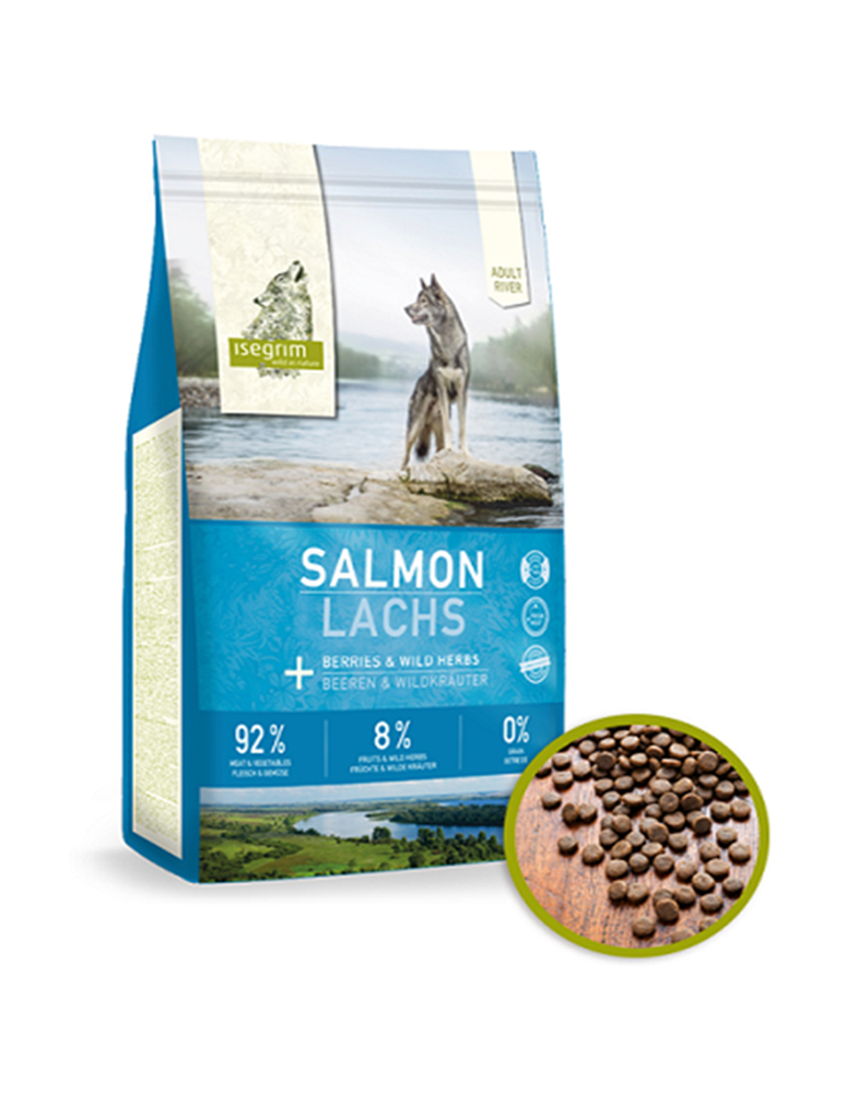 Isegrim River Adult Salmon with Berries - це смачний сухий корм з лососем для харчування дорослих собак всіх порід. Завдяки свіжому лососеві, корм містить велику кількість основних Омега-3 жирних кислот для здоров'я шкіри і краси шерсті собак. Зміст ягід і дикорослих трав забезпечує вихованцям необхідні вітаміни, мінерали та мікроелементи для підтримки міцного здоров'я і активності.