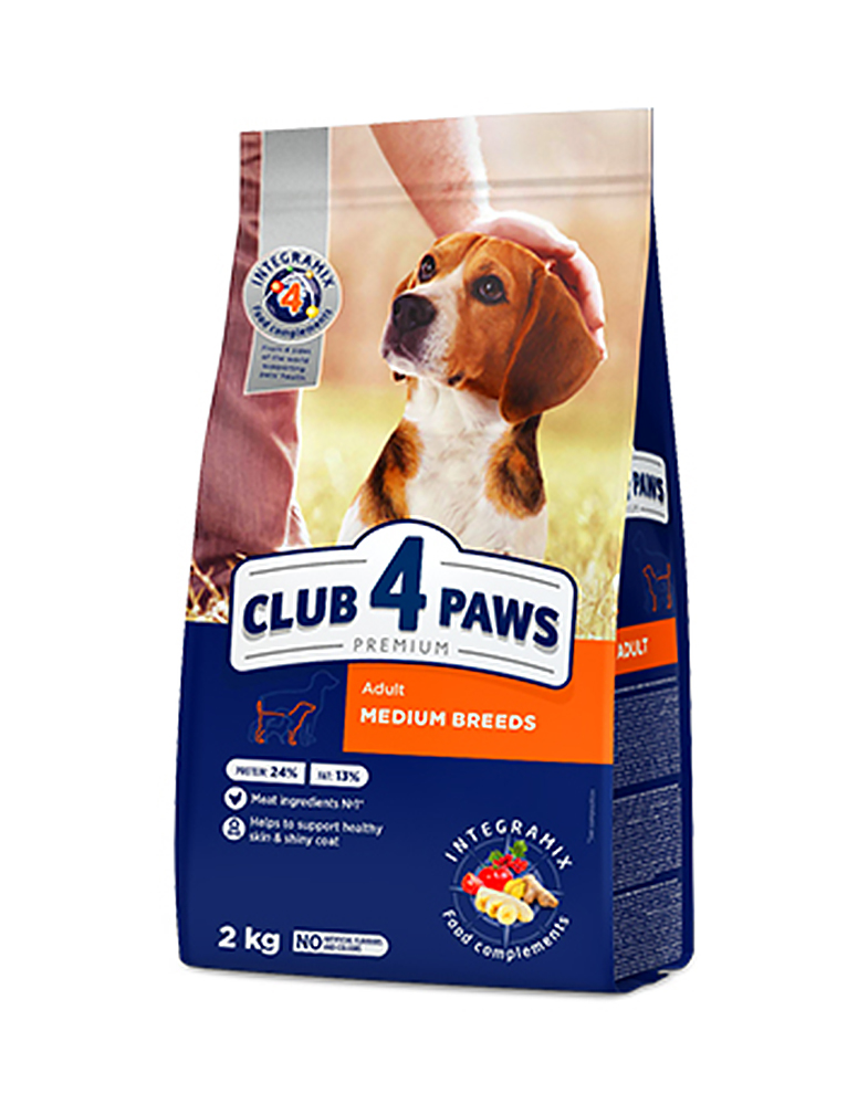 Клуб 4 лапи Premium Adult Medium Breeds - преміум-раціон містить м'ясні інгредієнти на першому місці в складі, збалансоване поєднання білків і жирів 24/13, і прекрасно підходить собакам середніх порід вагою від 11 до 25 кг і у віці від 1 року.
