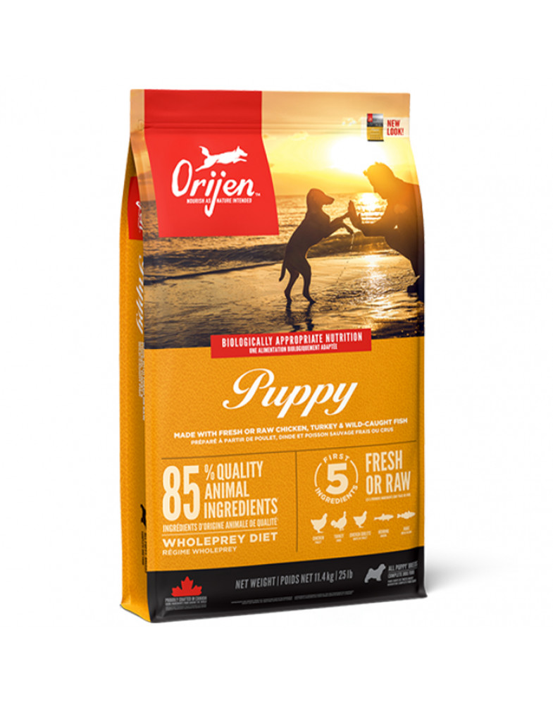 Orijen Puppy - біологічно відповідний корм для цуценят всіх порід з м'ясом свійської птиці та рибою. Для підтримки швидкого зростання і розвитку всім цуценятам необхідні раціони з високим вмістом білка і жиру з різноманітних видів свіжих м'ясних інгредієнтів. Собаки еволюціонували як м'ясоїдні, так само, як і у їх диких побратимів, їх травна система пристосована до м'ясних раціонів харчування, з високим вмістом протеїнів з різноманітних видів м'яса. Orijen містить високопоживне співвідношення м'ясних інгредієнтів, включаючи червоне м'ясо, органи і хрящі в поєднанні з рибою і цільними яйцями, забезпечуючи організм собак поживними компонентами з природного джерела. Всі інгредієнти з м'яса, визнаного придатним для вживання в їжу людиною.