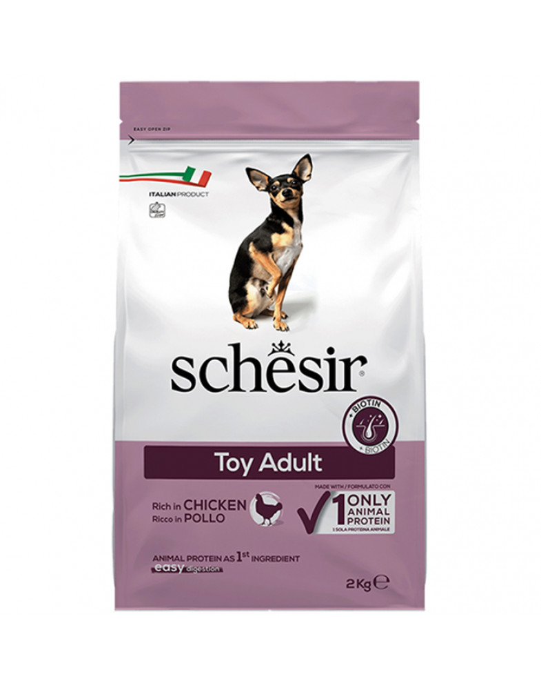 Schesir Dog Toy Adult - повноцінний збалансований раціон для собак міні порід від 1 до 7 років, що складається з натуральних інгредієнтів з додаванням комплексу вітамінів і мінералів, необхідних для здоров'я і довголіття вашого вихованця. Повністю задовольняє потреби собак в харчуванні і допомагає їм залишатися здоровими і активними. Корм призначений для собак міні порід, тому розмір і форма гранул спеціально для них адаптовані (міні гранула). Раціон також підходить для вагітних і годуючих сук.